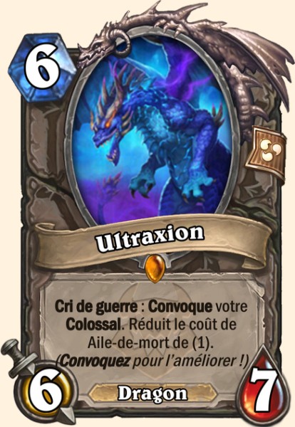 Ultraxion, une 6/7 pour 6 cristaux de mana est destiné au Voleur, Chaman, Chevalier de la mort, Guerrier, Chasseur de démons, et Démoniste. Son Cri de guerre convoque votre Colossal, et réduit le coût de Aile-de-mort de (1). Convocation est un nouveau mot-clé qui prépare le terrain pour l’arrivée du serviteur colossal de votre classe, et plus vous utilisez le mot-clé, plus votre serviteur colossal devient puissant
