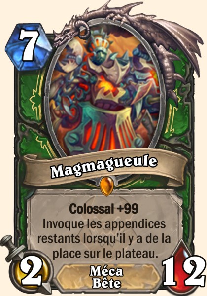 Magmagueule, une carte 2/12 pour 7 cristaux de mana, Invoque les appendices restants (corps de Magmagueule) lorsqu’il y a de la place sur le plateau.