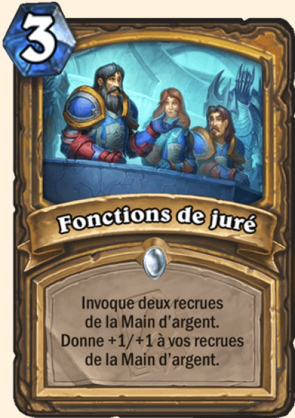 Parmi ces cartes, nous découvrons deux sorts, le Fonctions de juré pour 3 cristaux de mana, et l'Silence dans la salle qui réorganise votre deck selon le coût de vos cartes, du plus élevé au plus bas et qui vous fait piocher une carte.