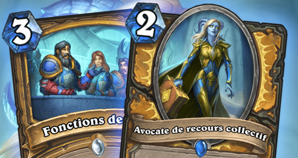 Côté serviteur, nous retrouvons Avocate de recours collectif qui fixe les caractéristiques d'un serviteur à 1/1 grâce à son Cri de guerre si votre deck ne contient aucune carte neutre.