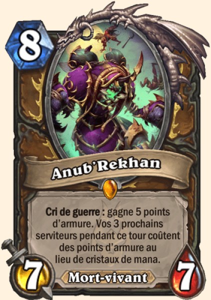 Cette fois-ci, c'est le Druide qui est mis à l'honneur avec la carte légendaire Anub'Rekhan. Son Cri de guerre vous permet de gagner 8 points d’armure. Pendant ce tour, vos serviteurs coûtent des points d’armures au lieu de cristaux de mana.