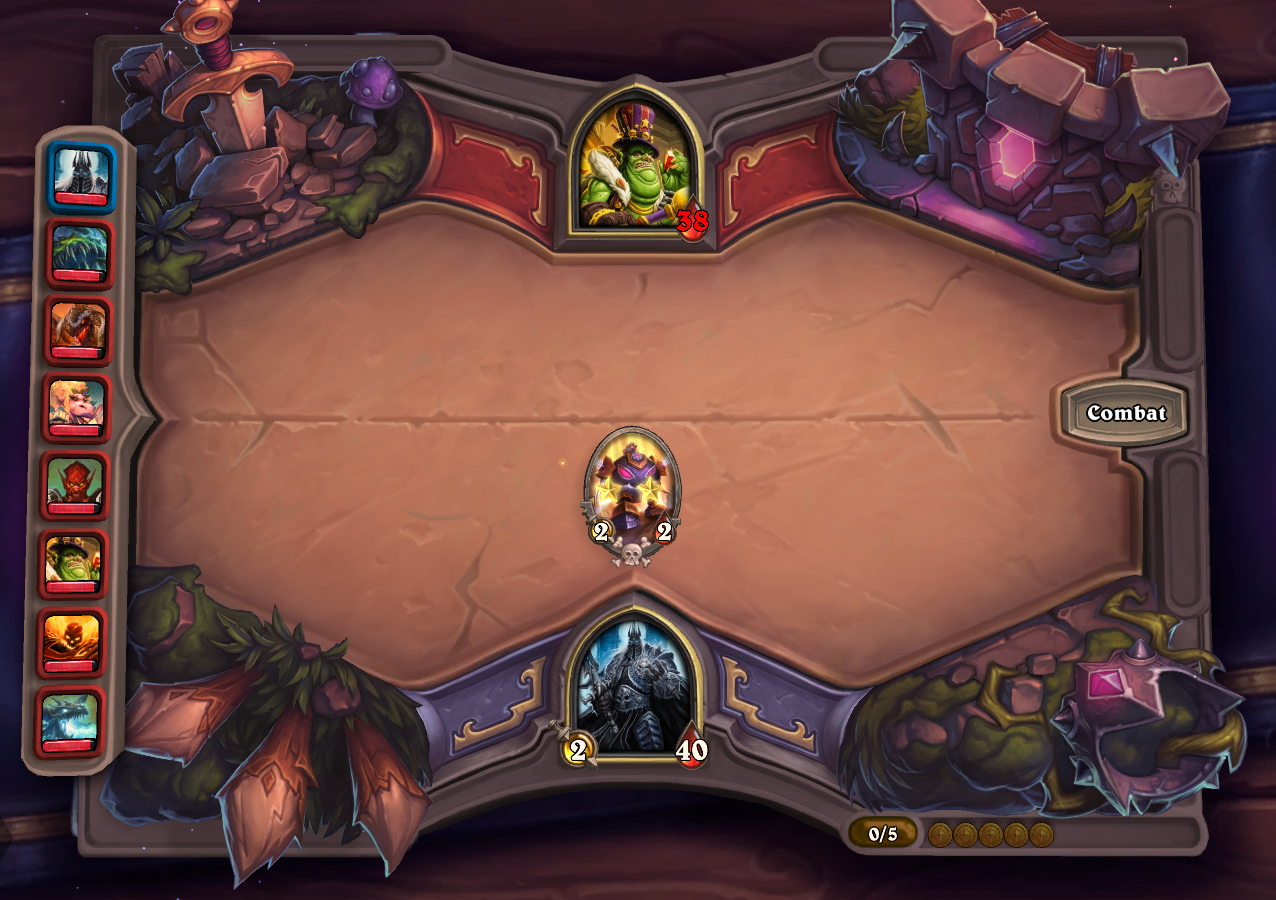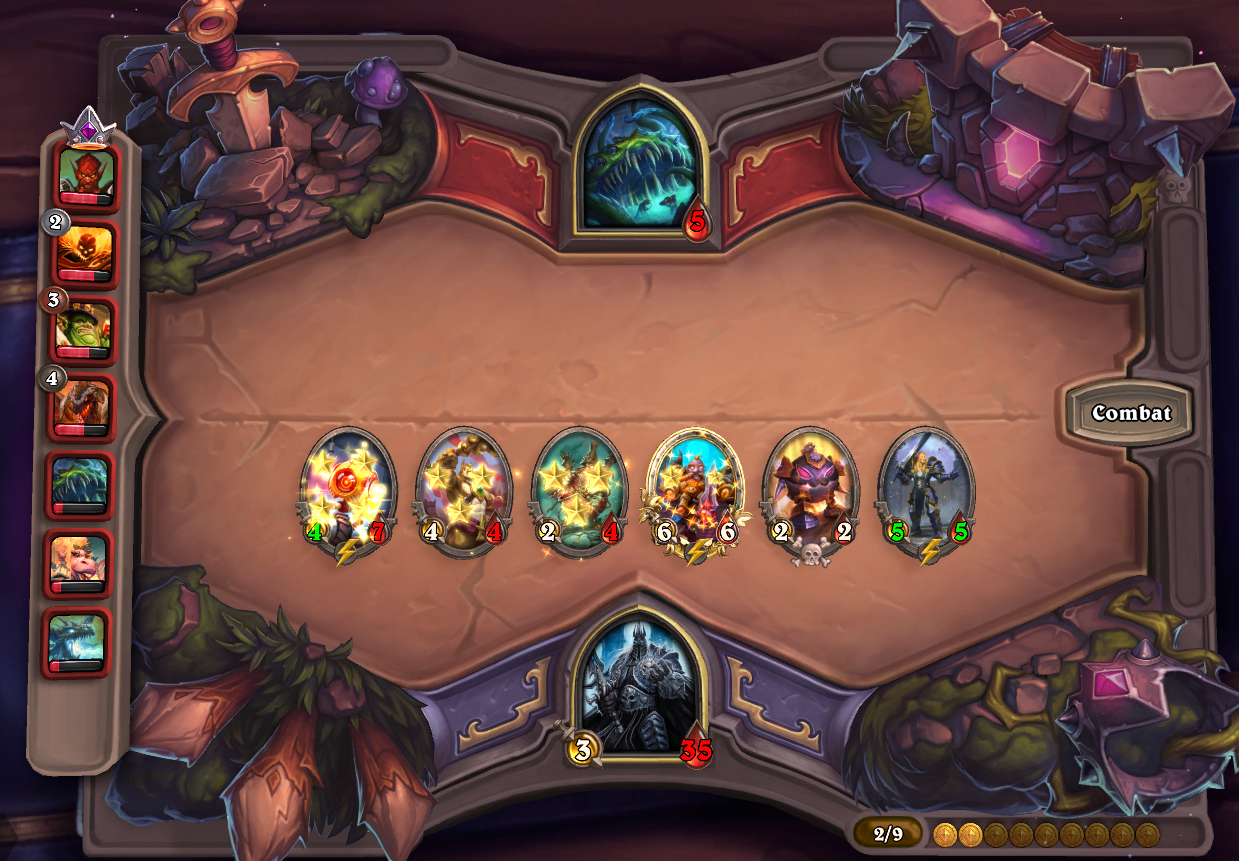 Une fois votre sélection effectuée dans la taverne de Bob, vous entrez dans le mode champs de bataille où vous attend 7 autres adversaires. La rencontre est choisie de manière aléatoire. Vous ne pouvez pas déplacer vous même vos serviteurs, ces derniers le font d'eux-même en commençant par le serviteur le plus à gauche de chaque joueur. Notez que l'ordre peut différer si l'un des serviteurs dispose d'un mot-clé tel que Provocation.