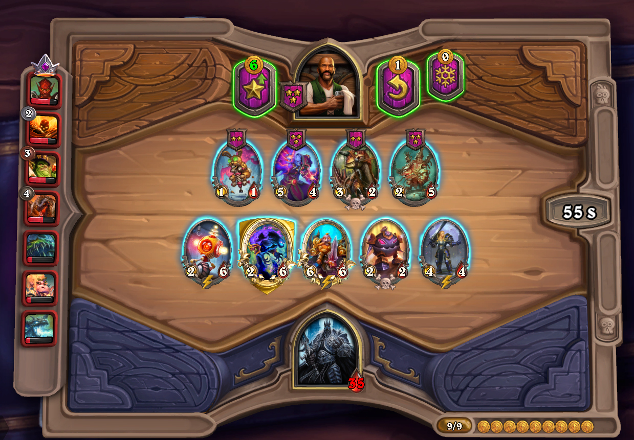 Comme nous vous l'indiquions un peu plus haut, il est possible de visionner à tout moment votre classement lors d'une partie de Champs de bataille grâce à la colonne latérale située sur votre gauche. En cliquant sur les portraits de vos adversaires, vous pouvez observer par exemple le niveau de leur taverne et ainsi prévoir le type de serviteurs que celui-ci peut disposer lors de votre prochaine rencontre.
