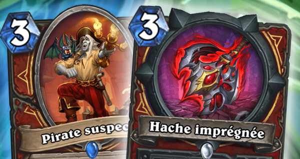 Ces deux cartes sont destinées au Guerrier. La première Pirate suspect coûte 3 cristaux de mana. Son Cri de guerre permet de découvrir une arme. Si votre adversaire devine votre choix, il ou elle en obtient une copie.