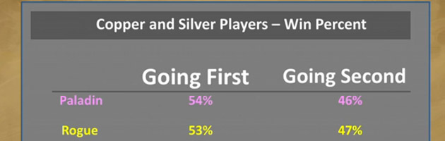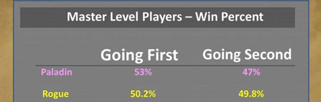 Pour répondre à cette question, Eric Dodds et Ben Brode ont fait un parallèle entre Hearthstone et les échecs. En effet, aux échecs à haut niveau, commencer la partie donne un léger avantage sur l'adversaire et le ratio de victoire moyen d'un joueur est de 54% s'il commence. Les deux graphiques ci-dessus montrent que l'écart est plus ou moins le même pour les joueurs d'un niveau inférieur, et qu'il se réduit à mesure que l'on progresse dans le classement.