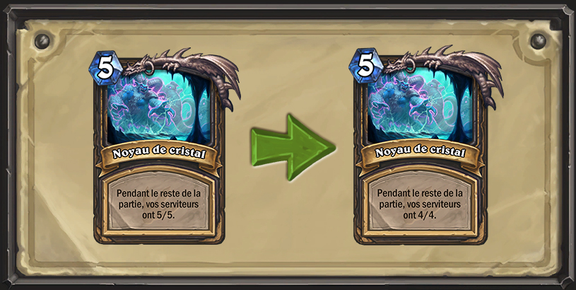 Nous pensons que Hearthstone gagne à avoir des interactions plus cohérentes, et nous sommes heureux que des decks articulés autour de la Sorcière des mers naga et des géants aient vu le jour. Nous sommes conscients qu’à l’heure actuelle, ce deck peut créer des situations trop extrêmes pour la plupart des classes dès le début de la partie. En portant le coût de la Sorcière des mers naga à 8 cristaux, le concept de base du deck reste intact, mais le combo devrait s’en trouver retardé, laissant le temps à la plupart des decks de prévoir l’arrivée de tous ces géants.