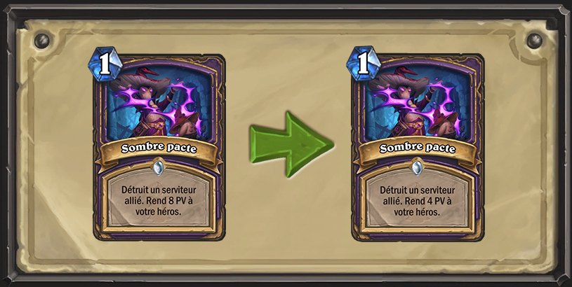 Sombre pacte est une carte puissante pour deux raisons. Avec son coût fixé à 1 cristal de mana, il est facile de l’associer à des cartes comme Cube carnivore, Laquais possédé et Chante-esprit Umbra pour réaliser des combos redoutables. Par ailleurs, ses soins sont tels que les démonistes peuvent utiliser Connexion de manière agressive et jouer des cartes comme Kobold de bibliothèque et Flammes infernales avec des conséquences moindres. Le coût de Sombre pacte reste inchangé pour préserver les combos possibles, mais nous avons réduit ses soins pour obliger les démonistes à être un peu plus vigilants vis-à-vis des dégâts qu’ils subissent.