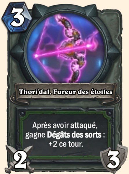 Il s'agit d'un serviteur légendaire pour le Chasseur, Vereesa Coursevent. 5/6 pour 7 , son Cri de guerre équipe votre héros de l'arme légendaire Thori'dal, la Fureur des étoiles. Après avoir attaqué, l'arme gagne Dégâts des sorts : +2 ce tour.