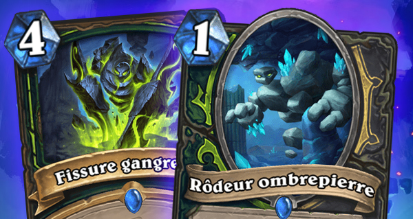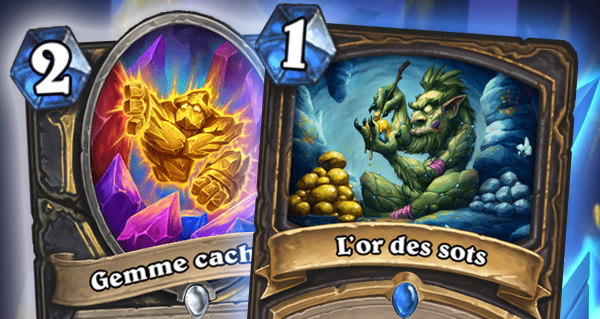 Ces 3 cartes sont issues du mini-set Exploration du Tréfonds qui sera disponible le 18 janvier prochain. Gemme cachée est une 2/2 avec un Camouflage. À la fin de votre tour, rend 2 PV à tous les personnages alliés. Mot de l'ombre : Vol coûte 5 cristaux de mana et renvoie un serviteur adverse dans votre main.