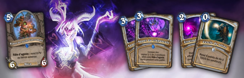 L'objectif est du deck est de tuer l'adversaire avec le râle d'agonie du Robot de soins corrompu. L'idée est donc d'arriver à faire mourir de notre côté du terrain deux Robots de soins corrompu (avec l'aide des Mandes-mirages), puis d'en ressusciter 4 grâce aux deux Appels du crépuscule. Enfin, on convertit les soins en dégâts avec Étreindre l'ombre et on détruit les 4 Robots de soins corrompu avec un Cercle de soins. Le combo coûte 8 et inflige un total de 32 points de dégâts en seulement 4 cartes !