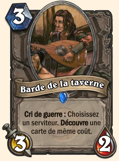 Des 3 cartes finalement sélectionnées par les participants du concours, celle de Dieu_Champignon a été la plus appréciée : le Barde de la taverne. Sa carte est une rare 3 2 pour 3 qui découvre une carte du même coût qu'un serviteur sur le terrain.