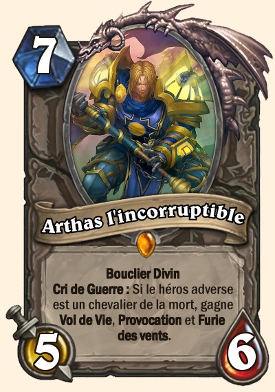 C'est pourquoi c'est devenu une légendaire avec un effet (très) fort. Mais il faut préciser qu'avec le flot de toxicités présentes avec l'extension, je me suis dit que s'en défaire n'était pas insurmontable pour l'adversaire. Enfin, j'ai pris une version "lumineuse" d'Arthas (coucou Ragnaros, porteur de Lumière), histoire de faire un pied-de-nez avec le thème de l'extension. Mais je trouve quelle s'intègre parfaitement au cartes de l'extension (surtout via l'artwork).