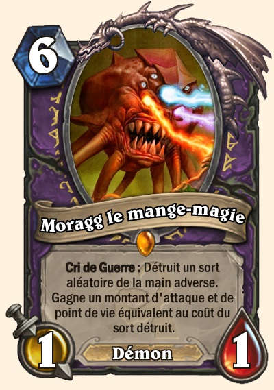 L'effet étant spécial, je ne voulais pas qu'il puisse être reproductible dans le deck. D'où la légendaire. J'avais déjà une idée assez précise de qui en tiendrait le rôle. Etant fan du lore, j'ai pioché dans les boss du Fort Pourpre. Moragg me plaisait assez, il est atypique. J'en ai fait une carte Démoniste pour coller au thème du démon, même si le Démoniste est peu joué en ce moment, et même si ce n'est pas une carte comme Moragg qui améliorerait les choses... Mais tant pis, je tenais trop à la cohérence."