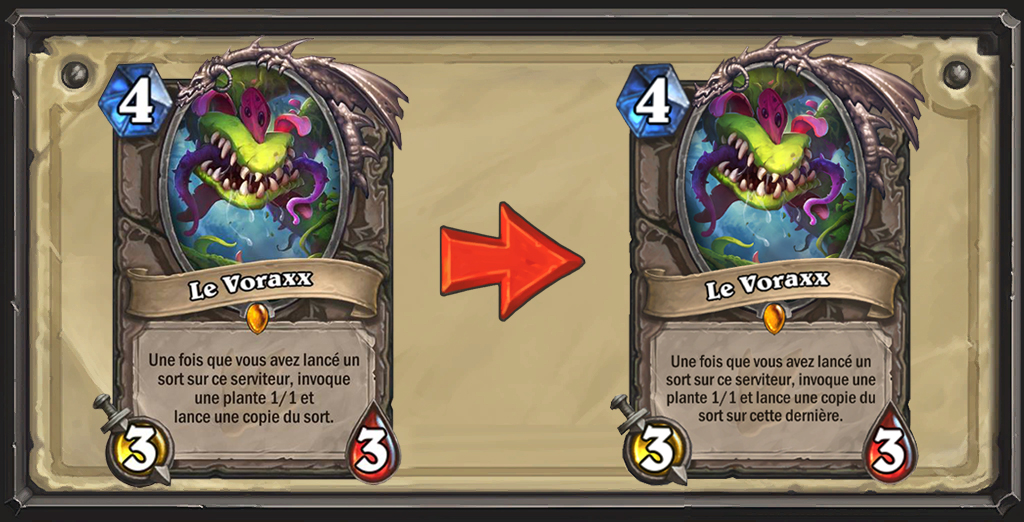 La mise à jour 8.0.4 corrige les textes de quelques cartes, comme par exemple le sort Paladin Adaptabilité qui était nommé Acclimatation et qui pouvait porter confusion avec le sort Druide. Le texte de la légendaire Le Voraxx devrait également être un peu plus clair.