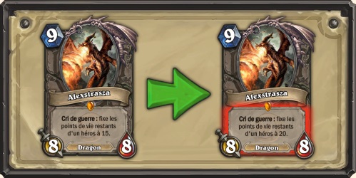 Afin de conserver son effet tout en favorisant son aspect soin, j'ai choisi de remonter le nombre de points de vie fixé par Alexstrasza à 20 . Ainsi, la carte reste intéressante pour infliger 10 points de dégâts à un adversaire tout en limitant les possibilités de combos non-interactives. De plus, le fait de se remonter à 20 est beaucoup plus décisif pour une carte à 9 .