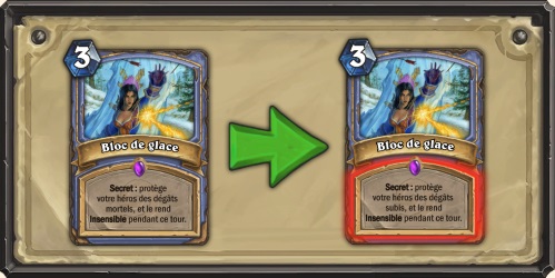 Pour remédier à ce soucis d'interactivité, j'ai modifié le texte du Bloc de glace afin qu'il se déclenche dès lors que Héros subit le moindre dégât. L"intérêt de cette modification est d'obliger le Mage a jouer le Bloc de glace au moment opportun et non pas n'importe quand pour gagner en tempo.