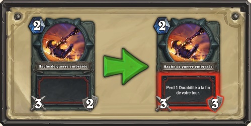 Pour remédier à ce problème, je propose d'ajouter un texte sur la carte :"Perd 1 Durabilité à la fin de votre tour" tout en lui ajoutant 1 de durabilité. Ainsi, la Hache de guerre embrasée devrait être utilisée au moment opportun et ne ferait planer la menace que pendant 3 tours. De plus, cette modification permettrait d'affaiblir le Guerrier Pirate qui se base principalement sur les améliorations des armes.