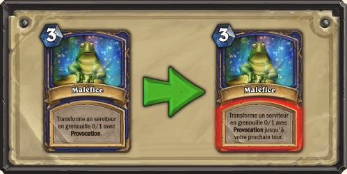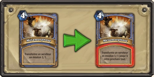 Afin de respecter un peu plus le lore de Warcraft et de rendre les cartes plus réfléchies, j'ai choisi de faire durer leur effet seulement pendant un tour. L'intérêt de cette modification est de rendre ces cartes plus situationnelles puisqu'il faut aussi avoir de quoi gérer la grenouille ou le mouton dans le même tour.