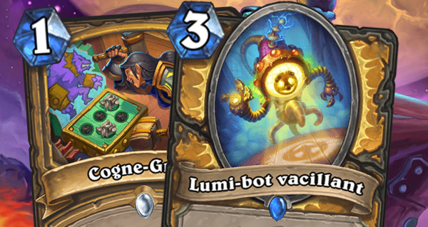 Lumi-bot vacillant coûte 3 et utilise le mot-clé Gigantification. Ce serviteur coûte (1) cristal de moins pour chaque sort du sacré que vous avez lancé pendant cette partie. Cette carte est suivi du sort Bâtons lumineux sacrés avec la mécanique Vol de vie et qui Inflige 4 points de dégâts. Coûte (1) cristal si vous avez lancé un sort du sacré pendant ce tour.