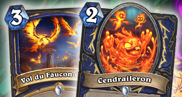 Cendraileron, une 1/2 pour 2 invoque une Braise crépitante 2/1 grâce à son Râle d’agonie. Le sort Vol du Faucon-de-feu vous permet de piocher deux serviteurs de types différents, et de leur donner +2/+2.