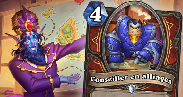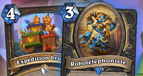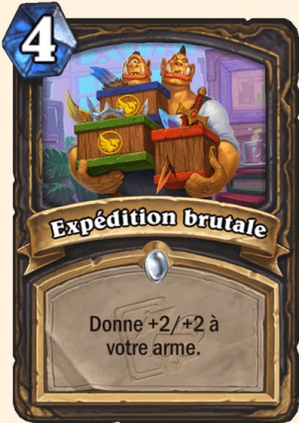 Les deux cartes suivantes sont Expédition brutale pour 4 qui donne +2/+2 à votre arme, et Espionnage institutionnel qui place une carte de chaque autre classe dans votre deck. Elles coûtent 1 cristal.