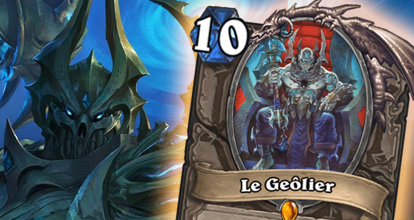 Nous nous trouvons en présence de la carte Le Geôlier, une 10/10 pour 10 cristaux de mana. Son Cri de guerre détruit votre deck et pendant le reste de la partie, vos serviteurs sont Insensibles.