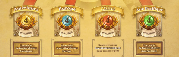 Et la Chine ?Vous pourrez consulter les informations relatives à la participation de la Chine sur le site officiel chinois de Hearthstone une fois celles-ci mises en ligne.