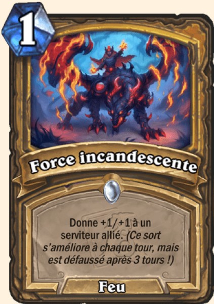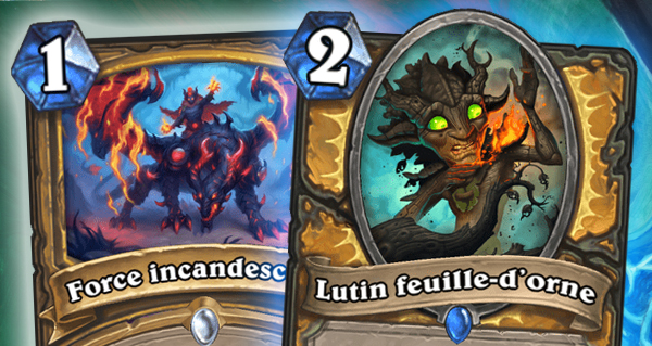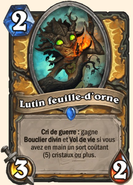 Force incandescente, un sort pour 1 cristal de mana, donne +1/+1 à un serviteur allié. Sachez que ce sort s’améliore à chaque tour, mais qu'il est défaussé après 3 tours. La carte suivante, Lutin feuille-d'orne lance un Cri de guerre qui permet de gagner Bouclier divin et Vol de vie si vous avez en main un sort coûtant (5) cristaux ou plus.