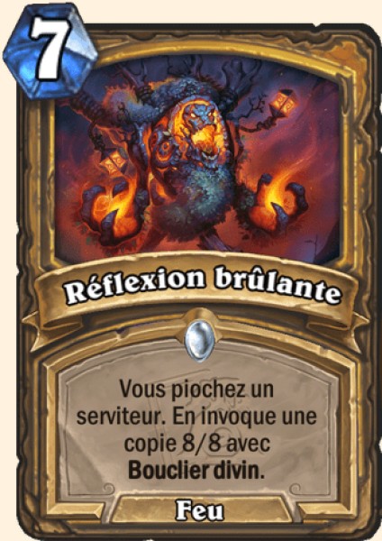La troisième, et dernière carte, Réflexion brûlante coûte 7 . Ce sort permet de piocher un serviteur. En invoque une copie 8/8 avec Bouclier divin.