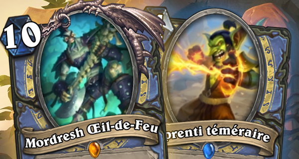 Mordresh Œil-de-Feu est une carte légendaire pour le Mage. Il s'agit d'une 10/10 pour cristaux de mana. Si votre pouvoir héroïque a infligé 10 points de dégâts pendant cette partie, son Cri de guerre permet d'en infliger autant à tous les adversaires.