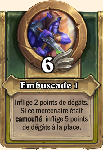 Embuscade Inflige 4 points de dégâts. Si ce mercenaire était camouflé, inflige 10 points de dégâts à la place Inflige 6 points de dégâts. Si ce mercenaire était camouflé, inflige 15 points de dégâts à la place Inflige 8 points de dégâts. Si ce mercenaire était camouflé, inflige 20 points de dégâts à la place Inflige 10 points de dégâts. Si ce mercenaire était camouflé, inflige 25 points de dégâts à la place |