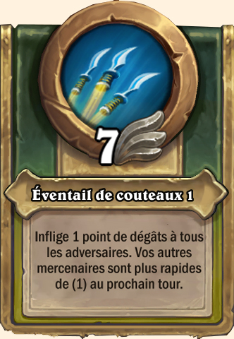 Éventail de couteaux Inflige 1 point de dégâts à tous les adversaires. [...] sont plus rapides de (2) au prochain tour Inflige 4 points de dégâts à tous les adversaires. [...] sont plus rapides de (2) au prochain tour Inflige 4 points de dégâts à tous les adversaires. [...] sont plus rapides de (3) au prochain tour Inflige 7 points de dégâts à tous les adversaires. [...] sont plus rapides de (3) au prochain tour |
