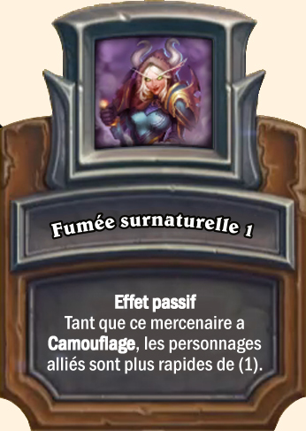 Fumée surnaturelle Tant que ce mercenaire a Camouflage, les personnages alliés sont plus rapides de (2) Tant que ce mercenaire a Camouflage, les personnages alliés sont plus rapides de (3) Tant que ce mercenaire a Camouflage, les personnages alliés sont plus rapides de (4) |