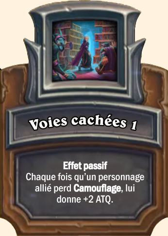Voies cachées Effet passif. Chaque fois qu’un personnage allié perd Camouflage, lui donne +4 ATQ Effet passif. Chaque fois qu’un personnage allié perd Camouflage, lui donne +5 ATQ Effet passif. Chaque fois qu’un personnage allié perd Camouflage, lui donne +6 ATQ |