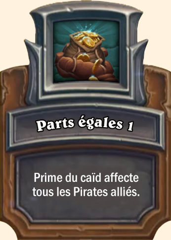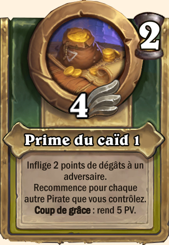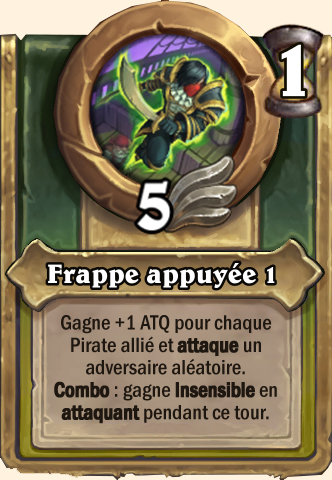 Frappe appuyée Gagne +2 ATQ pour chaque Pirate allié et attaque un adversaire aléatoire. Combo : [...] Gagne +3 ATQ pour chaque Pirate allié et attaque un adversaire aléatoire. Combo : [...] Gagne +4 ATQ pour chaque Pirate allié et attaque un adversaire aléatoire. Combo : [...] Gagne +5 ATQ pour chaque Pirate allié et attaque un adversaire aléatoire. Combo : [...] |