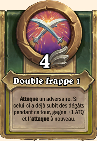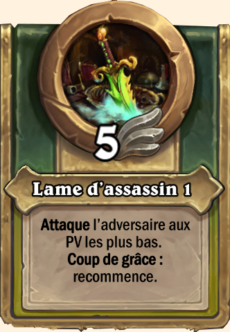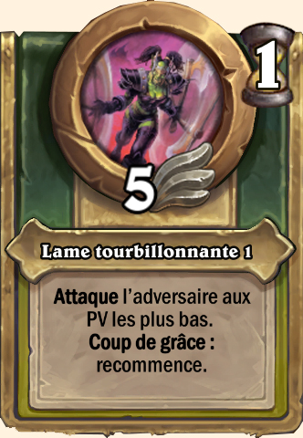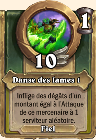 Danse des lames Inflige des dégâts d’un montant égal à l’Attaque de ce mercenaire à 2 serviteurs aléatoires Inflige des dégâts d’un montant égal à l’Attaque de ce mercenaire à 3 serviteurs aléatoires Inflige des dégâts d’un montant égal à l’Attaque de ce mercenaire à 3 serviteurs aléatoires Inflige des dégâts d’un montant égal à l’Attaque de ce mercenaire à 3 serviteurs aléatoires |