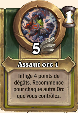 Assaut orc Gagne +2 ATQ. Inflige à un adversaire des dégâts d'un montant égal à l'Attaque de ce mercenaire Gagne +3 ATQ. Inflige à un adversaire des dégâts d'un montant égal à l'Attaque de ce mercenaire Gagne +4 ATQ. Inflige à un adversaire des dégâts d'un montant égal à l'Attaque de ce mercenaire Gagne +5 ATQ. Inflige à un adversaire des dégâts d'un montant égal à l'Attaque de ce mercenaire |