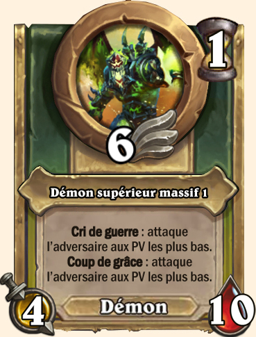 Démon supérieur massif [...]. Coup de grâce : attaque l’adversaire aux PV les plus bas (6/12) [...]. Coup de grâce : ce serviteur attaque l'adversaire aux PV les plus bas (8/14) [...]. Coup de grâce : ce serviteur attaque l'adversaire aux PV les plus bas (9/15) [...]. Coup de grâce : ce serviteur attaque l'adversaire aux PV les plus bas (10/16) |