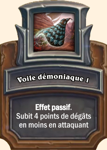 Voile démoniaque Effet passif. Subit 6 points de dégâts en moins en attaquant Effet passif. Subit 8 points de dégâts en moins en attaquant Effet passif. Subit 10 points de dégâts en moins en attaquant |