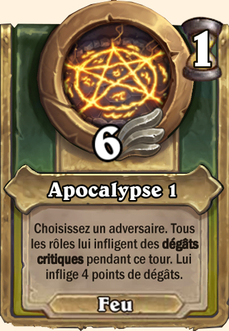 Apocalypse Choisissez un adversaire. [...] Lui inflige 7 points de dégâts Choisissez un adversaire. [...]. Lui inflige 10 points de dégâts Choisissez un adversaire. [...] Lui inflige 11 points de dégâts Choisissez un adversaire. [...] Lui inflige 12 points de dégâts |