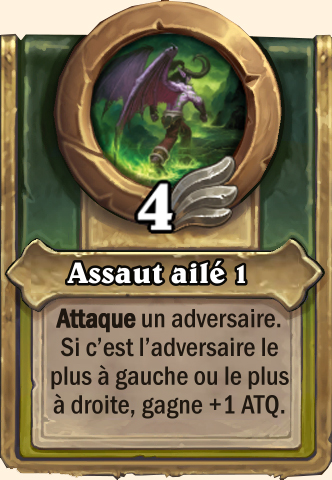 Assaut ailé Attaque un ennemi. Si c'est celui le plus à gauche ou à droite, gagne +2 ATQ Attaque un ennemi. Si c'est celui le plus à gauche ou à droite, gagne +3 ATQ Attaque un ennemi. Si c'est celui le plus à gauche ou à droite, gagne +4 ATQ Attaque un ennemi. Si c'est celui le plus à gauche ou à droite, gagne +5 ATQ |