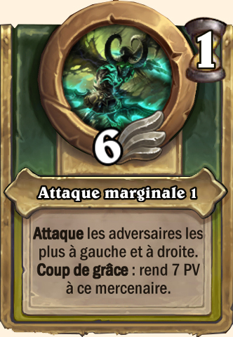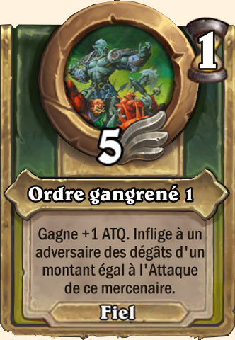 Ordre gangrené Gagne +2 ATQ. Inflige à un adversaire des dégâts d'un montant égal à l'Attaque de ce mercenaire Gagne +3 ATQ. Inflige à un adversaire des dégâts d'un montant égal à l'Attaque de ce mercenaire Gagne +4 ATQ. Inflige à un adversaire des dégâts d'un montant égal à l'Attaque de ce mercenaire Gagne +5 ATQ. Inflige à un adversaire des dégâts d'un montant égal à l'Attaque de ce mercenaire |