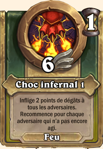 Choc infernal Inflige 3 points de dégâts à tous les adversaires. [...] Inflige 4 points de dégâts à tous les adversaires. [...] Inflige 5 points de dégâts à tous les adversaires. [...] Inflige 6 points de dégâts à tous les adversaires. [...] |
