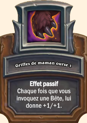 Griffes de maman ourse Effet passif. Chaque fois que vous invoquez une Bête, lui donne +2/+2 Effet passif. Chaque fois que vous invoquez une Bête, lui donne +3/+3 Effet passif. Chaque fois que vous invoquez une Bête, lui donne +4/+4 |