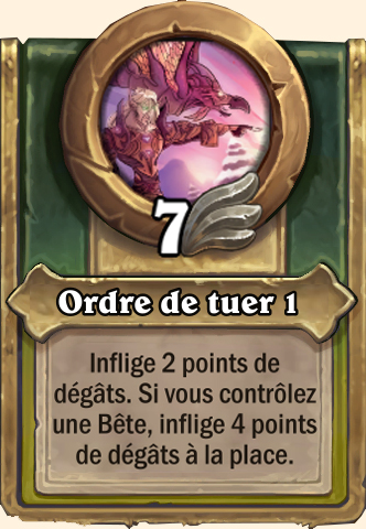 Ordre de tuer Inflige 5 points de dégâts. Si vous contrôlez une Bête, inflige 10 points de dégâts à la place Inflige 8 points de dégâts. Si vous contrôlez une Bête, inflige 14 points de dégâts à la place Inflige 9 points de dégâts. Si vous contrôlez une Bête, inflige 10 points de dégâts à la place Inflige 15 points de dégâts. Si vous contrôlez une Bête, inflige 16 points de dégâts à la place |