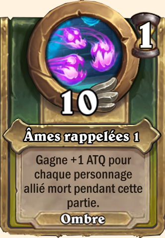 Âmes rappelées Gagne +2 ATQ pour chaque personnage allié mort pendant cette partie Gagne +3 ATQ pour chaque personnage allié mort pendant cette partie Gagne +4 ATQ pour chaque personnage allié mort pendant cette partie Gagne +5 ATQ pour chaque personnage allié mort pendant cette partie |