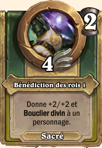 Bénédiction des rois Donne +4/+4 et Bouclier divin à un personnage Donne +6/+6 et Bouclier divin à un personnage Donne +7/+7 et Bouclier divin à un personnage Donne +8/+8 et Bouclier divin à un personnage |