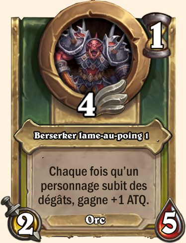 Berserker lame-au-poing Chaque fois qu’un personnage subit des dégâts, gagne +2 ATQ (3/9) Chaque fois qu’un personnage subit des dégâts, gagne +3 ATQ (4/13) Chaque fois qu’un personnage subit des dégâts, gagne +3 ATQ (5/14) Chaque fois qu’un personnage subit des dégâts, gagne +3 ATQ (6/15) |