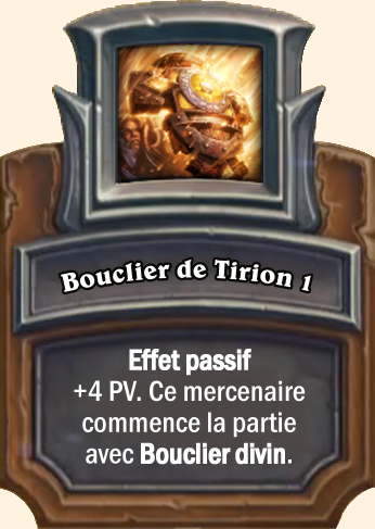 Bouclier de Tirion Effet passif. +6 PV. Ce mercenaire commence la partie avec Bouclier divin Effet passif. +8 PV. Ce mercenaire commence la partie avec Bouclier divin Effet passif. +10 PV. Ce mercenaire commence la partie avec Bouclier divin |