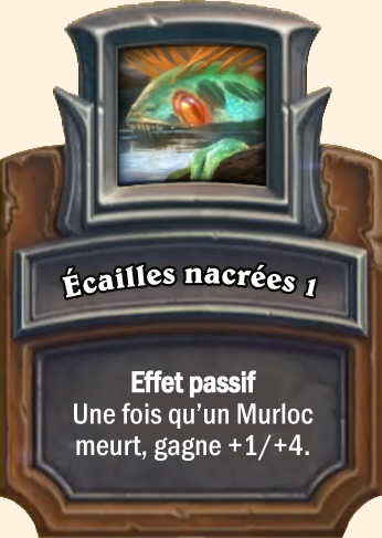Écailles nacrées Effet passif. Une fois qu’un Murloc meurt, gagne +1/+6 Effet passif. Une fois qu’un Murloc meurt, gagne +2/+8 Effet passif. Une fois qu’un Murloc meurt, gagne +2/+10 |